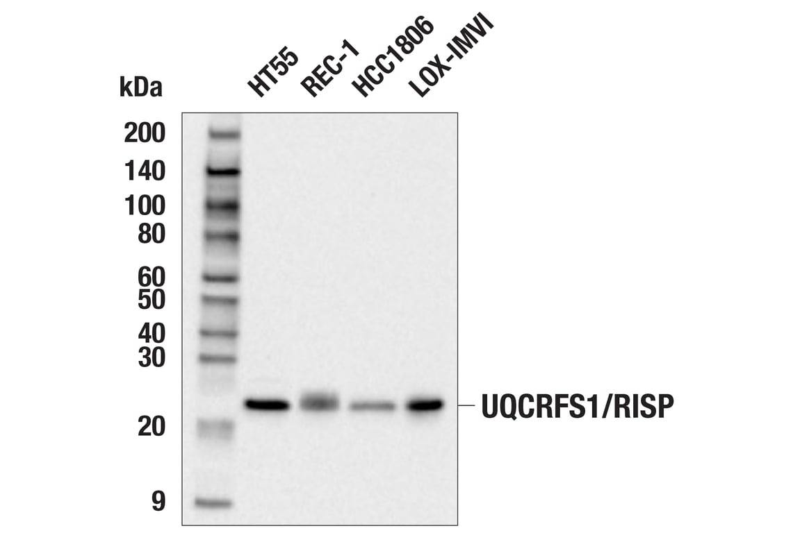 Ubiquinol-cytochrome c reductase iron-sulfur subunit (UQCRFS1), also known as Rieske iron-sulfur protein (RISP), is a component of Complex III in the mitochondrial electron transport chain. UQCRFS1/RISP and two other subunits, cytochrome b (MT-CYB) and cytochrome c1 (CYC1), are essential for the catalytic activity of Complex III (1). Studies show that UQCRFS1/RISP is required for fetal mouse hematopoietic stem cell differentiation and adult mouse hematopoietic stem cell quiescence (2). In addition, loss of UQCRFS1/RISP decreases the strength of T cell receptor (TCR) signaling, indicating that this protein is critical for optimal TCR signaling (3).