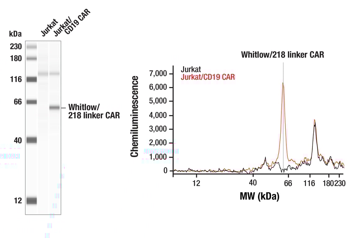 Whitlow/218 Linker (E3U7Q) Rabbit Monoclonal Antibody recognizes exogenously expressed levels of scFv-based CARs containing a Whitlow/218 linker. This antibody is not approved for traditional Western blot analysis.