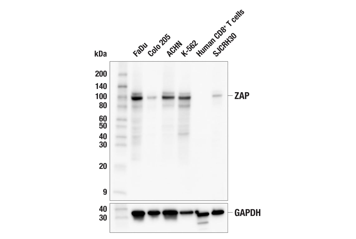 ZAP (E7E8D) Rabbit Monoclonal Antibody recognizes endogenous levels of total ZAP protein. This antibody recognizes ZAP isoform 1.