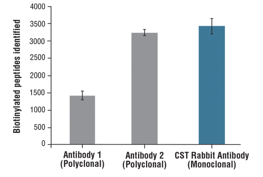 New assays have been developed that improve elucidation of protein subcellular context, localization, and protein-protein interactions. These new cellular assays utilize biotin ligase or engineered ascorbate peroxidase (APEX) fusion proteins that are able to biotinylate nearby protein targets within specific cellular compartments. This type of biotin proximity assay can provide improved information about subcellular localization, multi-subunit components, and recruitment of unknown targets. Using CST's in house developed anti-biotin rabbit monoclonal antibody; we have developed a robust procedure for immunoaffinity enrichment followed by mass spectrometry analysis using CST’s proprietary PTMScan(R) protocols. This allows for identification of biotinylated targets and investigation of new protein interactions. This assay provides rich data for these types of biotin proximity assays such as the APEX (6,7) engineered cell system and other related methods.