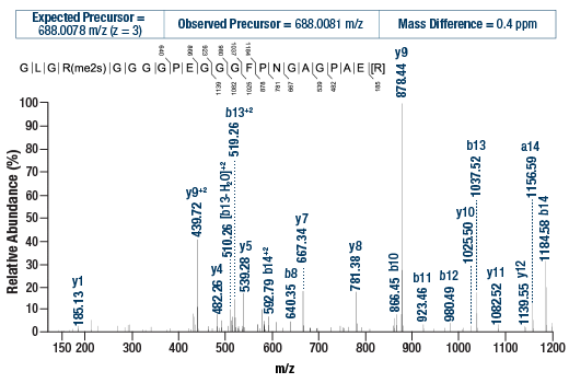 The PTMScan® Control Peptides Symmetric Di-Methyl Arginine enable quality control of immunoaffinity enrichment performance using PTMScan® or PTMScan® HS workflows.  These synthetic peptides contain a specific post-translational modification (PTM) that can be enriched by the associated PTMScan® or PTMScan® HS immunoaffinity purification (IAP) beads, as well as a stable heavy isotope that can be distinguished from endogenous peptides by the mass spectrometer.
