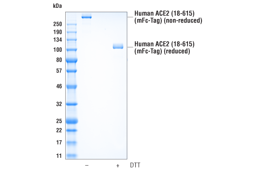 Human ACE2 (18-615) Recombinant Protein (mFc-Tag) is derived from a recombinant expression construct corresponding to the extracellular domain of human ACE2 protein, including the sequence regions that function as receptors for SARS and SARS-CoV-2 coronaviruses. The expressed protein contains a murine Fc-Tag at its carboxy terminus.