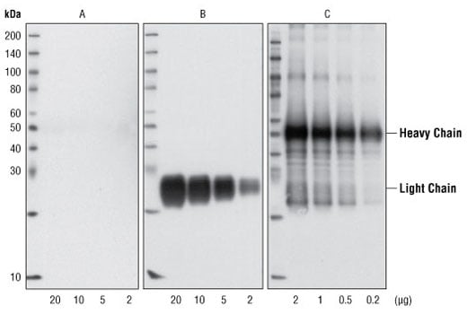 Mouse Anti-rabbit IgG (Light-Chain Specific) (L57A3) mAb only reacts with the light chain of rabbit IgG and does not bind to the denatured and reduced rabbit IgG heavy chain. When performing immunopreciptiation (IP) followed by western blotting, the denatured rabbit IgG heavy chain of the primary antibody used for IP runs at approximately 50 kDa on the subsequent western blot and can often obscure bands of proteins that have a similar molecular weight. Using Mouse Anti-Rabbit IgG (Light-Chain Specific) (L57A3) mAb as a secondary antibody will eliminate this problem.