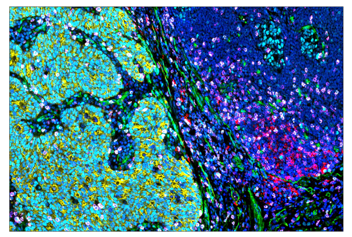 SignalStar Oligo-Antibody Pairs are compatible with the SignalStar Multiplex IHC Buffer Kits for use in fluorescent multiplex imaging experiments. This product includes the oligo-conjugated antibodies and complementary oligos required for labeling your target protein on up to 10 slides. SignalStar Multiplex IHC Buffer Kits are required to amplify and image the target signal. Multiple oligo-antibody pairs can be conveniently combined into a multiplex panel using the SignalStar Multiplex IHC Panel Builder. SignalStar Multiplex IHC Kits & Reagents are not compatible with all of Cell Signaling Technology® products and protocols that are recommended for use in immunohistochemical assays.