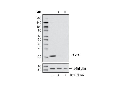 SignalSilence® RKIP siRNA I from Cell Signaling Technology (CST) allows the researcher to specifically inhibit RKIP expression using RNA interference, a method whereby gene expression can be selectively silenced through the delivery of double stranded RNA molecules into the cell. All SignalSilence® siRNA products from CST are rigorously tested in-house and have been shown to reduce target protein expression by western analysis.