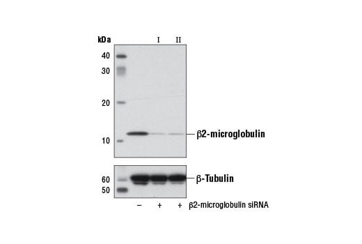 CST recommends transfection with 100 nM SignalSilence® β2-microglobulin siRNA I 48 to 72 hours prior to cell lysis. For transfection procedure, follow protocol provided by the transfection reagent manufacturer. Please feel free to contact CST with any questions on use.