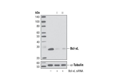 SignalSilence® Bcl-xL siRNA I from Cell Signaling Technology (CST) allows the researcher to specifically inhibit Bcl-xL expression using RNA interference, a method whereby gene expression can be selectively silenced through the delivery of double stranded RNA molecules into the cell. All SignalSilence® siRNA products from CST are rigorously tested in-house and have been shown to reduce target protein expression by western analysis.