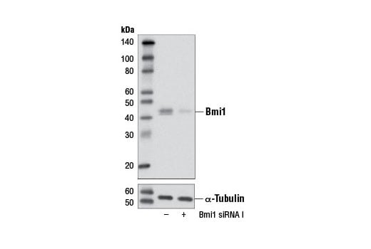 SignalSilence® Bmi1 siRNA I from Cell Signaling Technology (CST) allows the researcher to specifically inhibit Bmi1 expression using RNA interference, a method whereby gene expression can be selectively silenced through the delivery of double stranded RNA molecules into the cell. All SignalSilence® siRNA products from CST are rigorously tested in-house and have been shown to reduce target protein expression by western analysis.