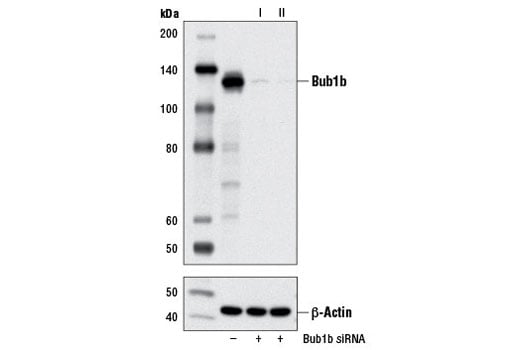 CST recommends transfection with 100 nM SignalSilence® Bub1b siRNA II 48 to 72 hours prior to cell lysis. For transfection procedure, follow protocol provided by the transfection reagent manufacturer. Please feel free to contact CST with any questions on use.