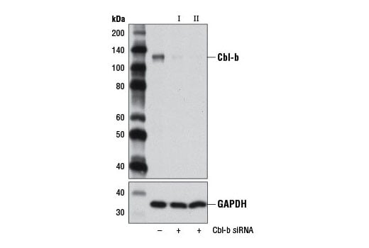 CST recommends transfection with 100 nM SignalSilence® Cbl-b siRNA I 48 to 72 hours prior to cell lysis. For transfection procedure, follow protocol provided by the transfection reagent manufacturer. Please feel free to contact CST with any questions on use.