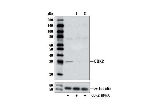 CST recommends transfection with 100 nM SignalSilence® CDK2 siRNA I 48 to 72 hours prior to cell lysis. For transfection procedure, follow protocol provided by the transfection reagent manufacturer. Please feel free to contact CST with any questions on use.