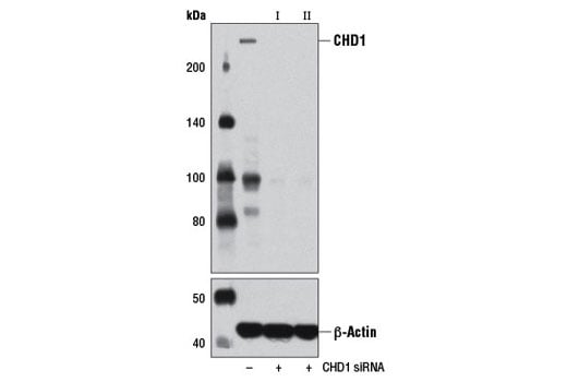 CST recommends transfection with 100 nM SignalSilence® CHD1 siRNA II 48 to 72 hours prior to cell lysis. For transfection procedure, follow protocol provided by the transfection reagent manufacturer. Please feel free to contact CST with any questions on use.