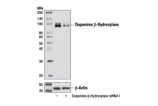 CST recommends transfection with 100 nM SignalSilence® Dopamine β-Hydroxylase (DBH) siRNA I 48 to 72 hours prior to cell lysis. For transfection procedure, follow protocol provided by the transfection reagent manufacturer. Please feel free to contact CST with any questions on use.