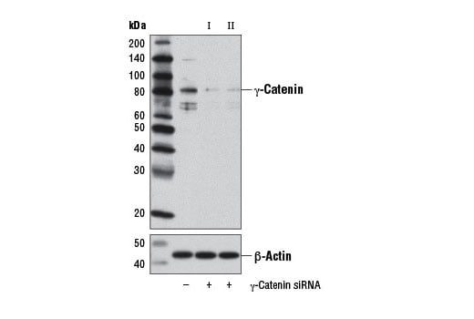 CST recommends transfection with 100 nM SignalSilence® γ-Catenin siRNA II (Mouse Specific) 48 to 72 hours prior to cell lysis. For transfection procedure, follow protocol provided by the transfection reagent manufacturer. Please feel free to contact CST with any questions on use.