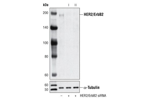 CST recommends transfection with 100 nM SignalSilence® HER2/ErbB2 siRNA I 48 to 72 hours prior to cell lysis. For transfection procedure, follow protocol provided by the transfection reagent manufacturer. Please feel free to contact CST with any questions on use.