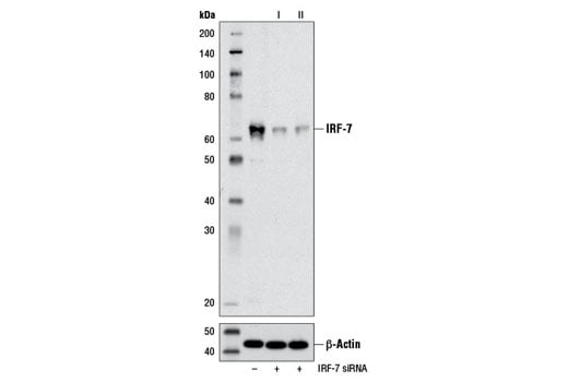 CST recommends transfection with 100 nM SignalSilence® IRF-7 siRNA I 48 to 72 hours prior to cell lysis. For transfection procedure, follow protocol provided by the transfection reagent manufacturer. Please feel free to contact CST with any questions on use.
