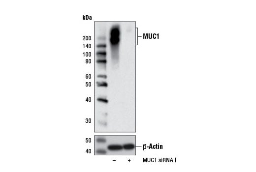 CST recommends transfection with 100 nM SignalSilence® MUC1 siRNA I 48 to 72 hours prior to cell lysis. For transfection procedure, follow protocol provided by the transfection reagent manufacturer. Please feel free to contact CST with any questions on use.