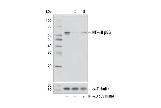CST recommends transfection with 100 nM SignalSilence® NF-kappaB p65 siRNA I (Mouse Specific) 48 to 72 hours prior to cell lysis. For transfection procedure, follow protocol provided by the transfection reagent manufacturer. Please feel free to contact CST with any questions on use.