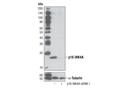 CST recommends transfection with 100 nM SignalSilence® p16 INK4A siRNA I 48 to 72 hours prior to cell lysis. For transfection procedure, follow protocol provided by the transfection reagent manufacturer. Please feel free to contact CST with any questions on use.