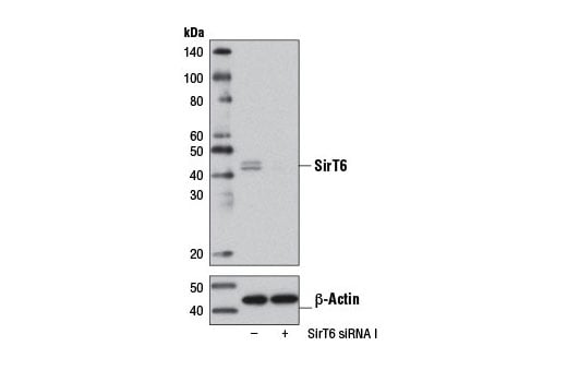 CST recommends transfection with 100 nM SignalSilence® SirT6 siRNA I 48 to 72 hours prior to cell lysis. For transfection procedure, follow protocol provided by the transfection reagent manufacturer. Please feel free to contact CST with any questions on use.