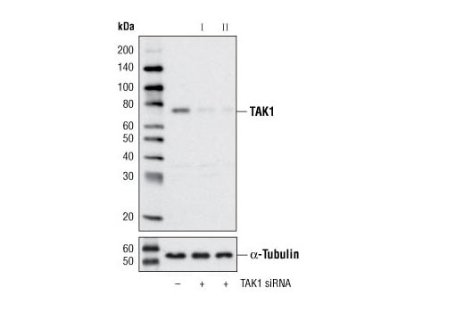 CST recommends transfection with 100 nM SignalSilence® TAK1 siRNA I 48 to 72 hours prior to cell lysis. For transfection procedure, follow protocol provided by the transfection reagent manufacturer. Please feel free to contact CST with any questions on use.