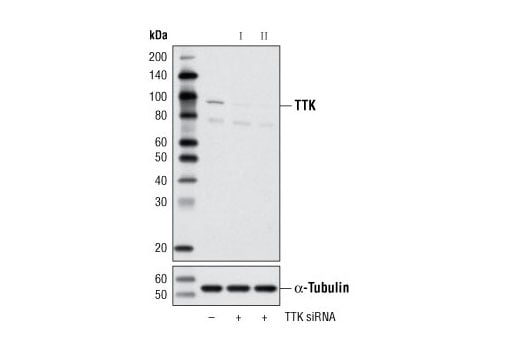 CST recommends transfection with 100 nM SignalSilence® TTK siRNA II 48 to 72 hours prior to cell lysis. For transfection procedure, follow protocol provided by the transfection reagent manufacturer. Please feel free to contact CST with any questions on use.