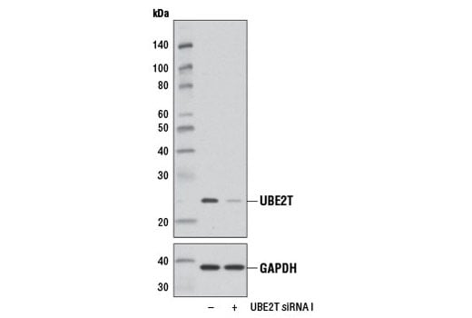 CST recommends transfection with 100 nM SignalSilence® UBE2T siRNA I 48 to 72 hours prior to cell lysis. For transfection procedure, follow protocol provided by the transfection reagent manufacturer. Please feel free to contact CST with any questions on use.