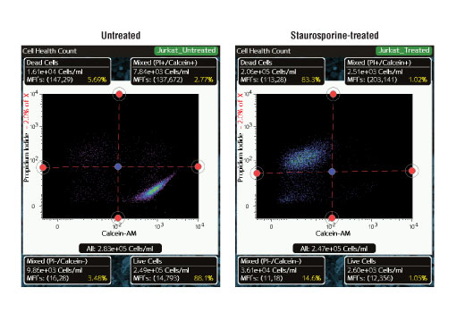 Measures of cell viability and cytotoxicity are broadly used to study the effects of growth factors and cytokines, inhibitors and activators, and immune response signals. Calcein-AM is the acetomethoxyl form of calcein, a highly lipophilic, cell membrane permeable dye. Intracellular esterase activity converts the non-fluorescent Calcein-AM to the highly fluorescent Calcein, which is retained only within live cells (1,2). The DNA-binding agent PI is cell membrane impermeable and only enters dead cells or those with damaged cell membranes. Intracellular PI binds DNA and undergoes an approximate 40-fold enhancement in fluorescence intensity. As a result, live cells will produce a strong green fluorescence resulting from the conversion of Calcein-AM to Calcein, while dead cells produce a strong red fluorescence due to the presence of PI (3,4). These fluorescent signals can be detected using the Cell Health application on the CellSimple™ Cell Analyzer.