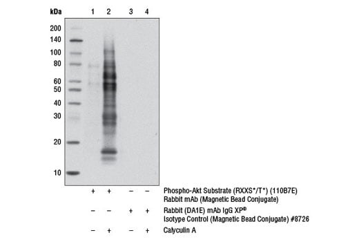 Phospho-Akt Substrate (RXXS*/T*) (110B7E) Rabbit mAb (Magnetic Bead Conjugate) is useful for immunoprecipitation of phosphorylated Akt substrate proteins.